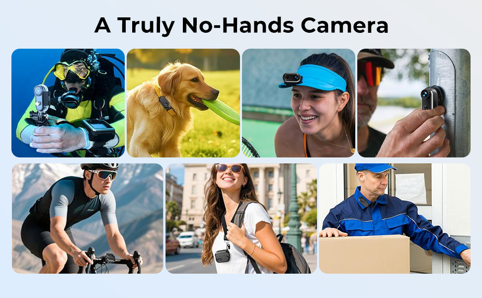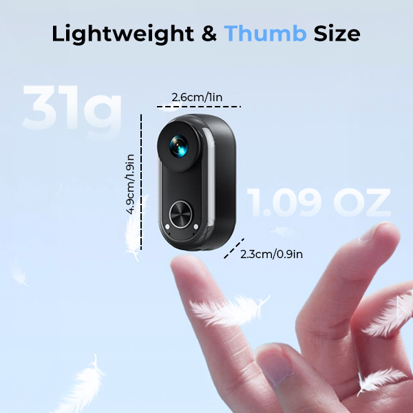 • 新しいポケットサイズの冒険パートナーをご紹介します:1.9インチ×1インチ×0.9インチ(親指サイズ!)で、財布、ポケット、小さなギアループに収まります。わずか1.09オンス(31g)—鍵セットよりも軽く、ハイキングやランニング中の首への負担ゼロ。ウェアラブルカメラをヘルメット、自転車、ペットの首輪にクリップで装着—かさばるチェストカメラでの手間取りによる瞬間の見逃しはもうありません。