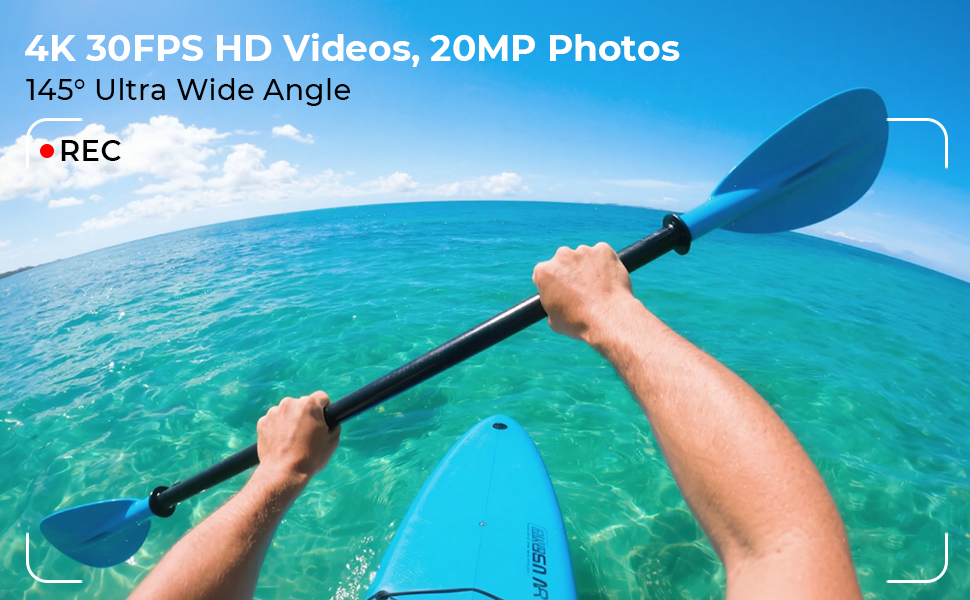 カメラは驚くべき4K/30FPS HDビデオと鮮明な20MP写真を提供し、詳細な思い出を捉えるのに最適です。145°の超広角レンズにより、周囲の風景をより多く撮影でき、風景、グループ写真、またはシーン全体を捉えたいアクションスポーツに最適です。