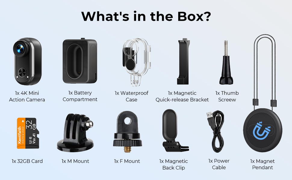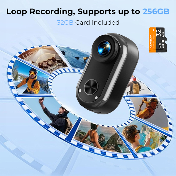 • * 1.09 OZ (31G) 親指サイズ&ワイヤレス共有: Kentfaithの4K超小型アクションカメラは親指よりも小さく(1.9x1x0.9in/4.9x2.6x2.3cm、1.09oz/35.7g)、装着時に軽量で目立ちません。内蔵2.4GHz Wi-Fiを搭載し、このミニボディカメラはViipulseアプリに接続して冒険を即座に共有できます。
