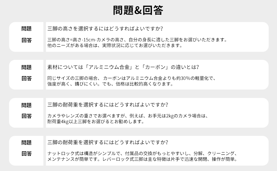 - * 【カーボン素材】このカメラ三脚はアルミよりも耐久性があり軽量なカーボンファイバー素材を採用しています。高温硬化、高圧強化で作られ、堅さがより強く、使用寿命がより長いです。