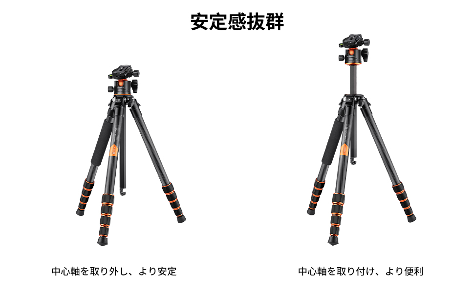 - * 【中心軸反転】三脚の中心軸を逆にして、超低角度撮影、マクロ撮影を実現します。ナットロック式設計により、すべての脚をすばやく開閉できます。