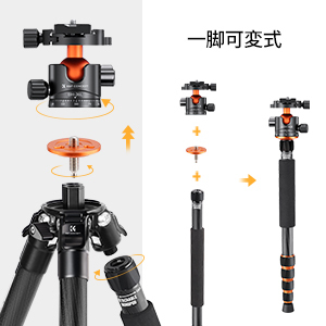 - * 【一脚可変式】脚の一つは本体から取り外して、一脚として使えます。、数秒で取り外された脚は中軸に取り付けて一脚に変型できます。一脚はカメラ、デジタルカメラ、望遠レンズにも対応。また旅行登山用のステッキとしても利用できます。