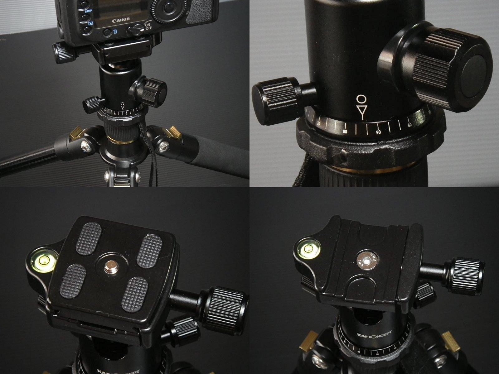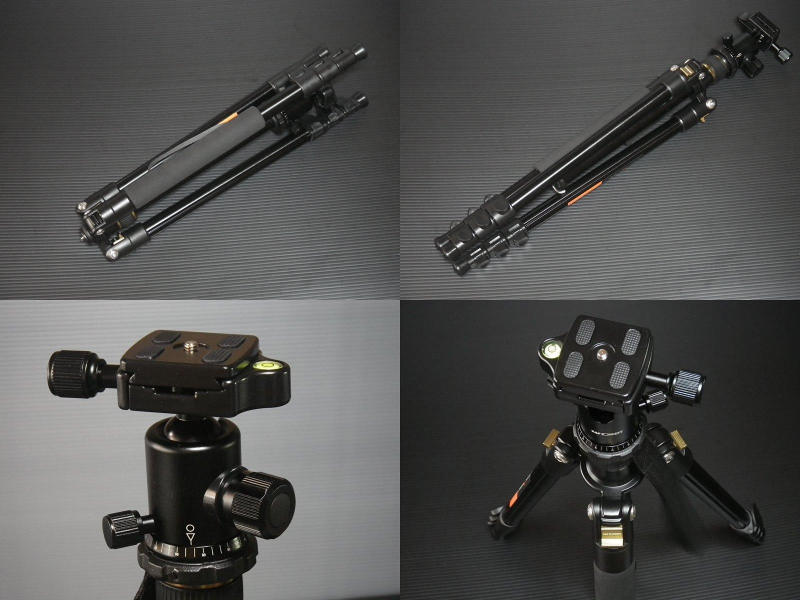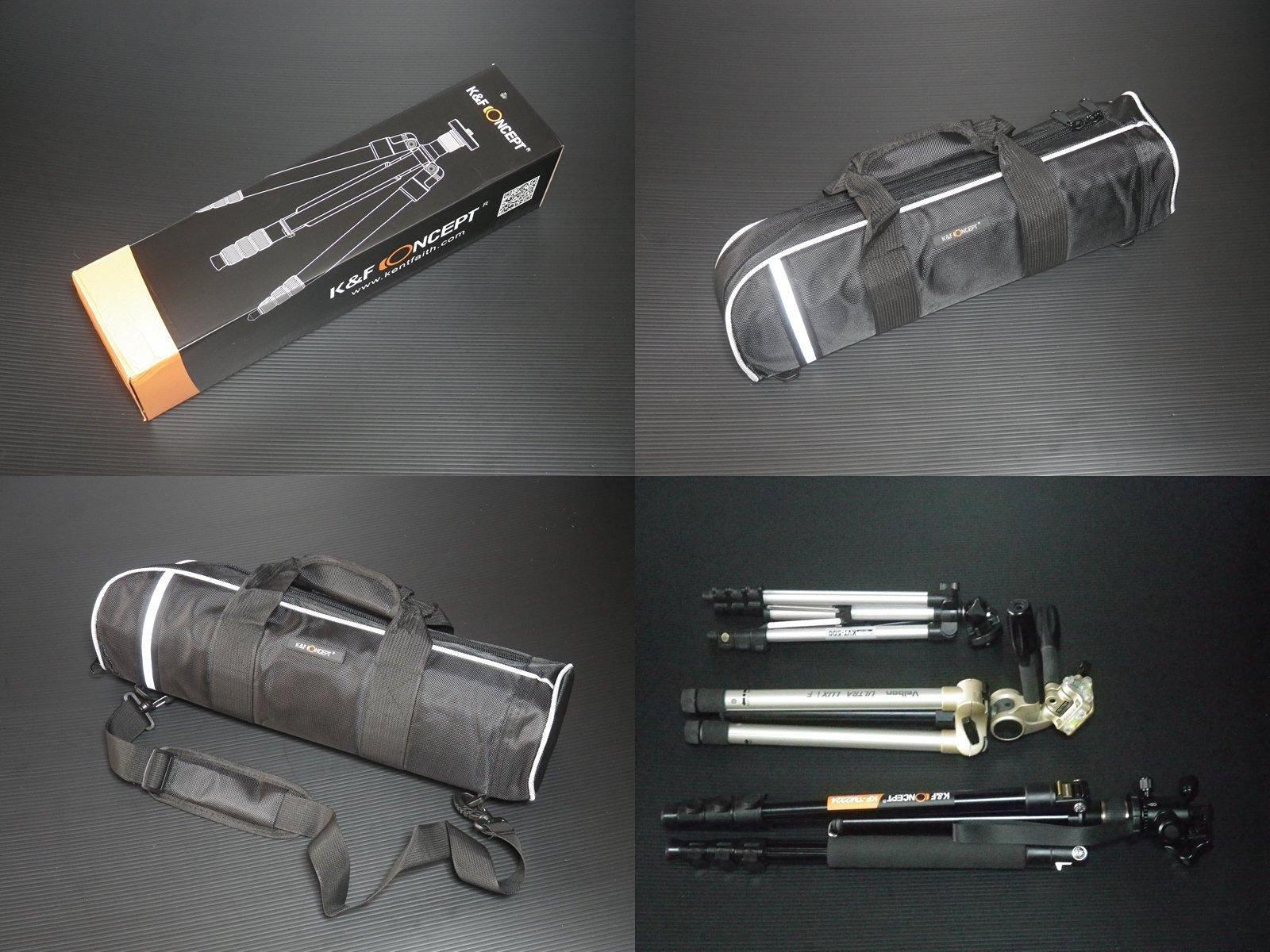 カメラを本格的に始めると、三脚を3本以上購入することになると聞いたことがあります。初めてこの話を聞いた時は、三脚メーカーの陰謀かと聞き流していましたが、気が付けば自分も3本揃える事になりました。最初はコンデジや小型ビデオカメラだけなので安価な製品で…(1台目)デジイチを買ったからちょっと高級な、耐荷重も3kgくらいの…(2台目)デジイチ+望遠レンズ+補助照明で装備重量が5kgを超える…(←イマココ)K&F Concept KF-TM2324 は全高:1580mm、4段、アルミ製の三脚ですが、耐荷重が8kgという点と、アルミ製でありながら雲台も含めた総重量が1856gと軽量だったのでこのモデルを選びました。フレームがしっかりしており、ウエイト吊り下げ用のフックも付いているので安定感も増し、このモデルで正解でした。ローアングルでのセッティングが可能なのも個人的には嬉しく、物撮りにでも多用しそうです。ただ、ローアングル設定時は脚部ヒンジにロックが掛からないのでカメラを地面にぶつけないように注意が必要です。自由雲台はボールをネジで固定するタイプですが、パンの可動部だけは独立しています。今までティルトとx軸水平が別々に調整可能な雲台を使っていたので調整時にヒヤリとしましたが、雲台だけ別の物に変えることも出来るので、どうしても使いづらい時は載せ替えたいと思います。その場合もフレームはしっかりしているので雲台の選択肢も増えそうです。キャリーバッグはショルダーベルトの脱着も可能なタイプでしっかりとした造りです。フレームの塗装などは少々荒さが目立ちますが、個人的には許容範囲内です。たとえどんな塗装がしてあっても使い込めば傷は避けられないのであまり気にしません。雲台調整に慣れるまで時間が掛かりそうですが、3本目の三脚は星5つです。