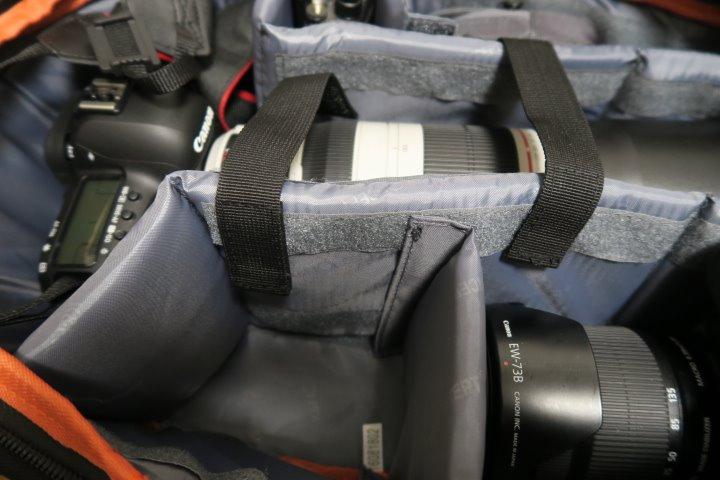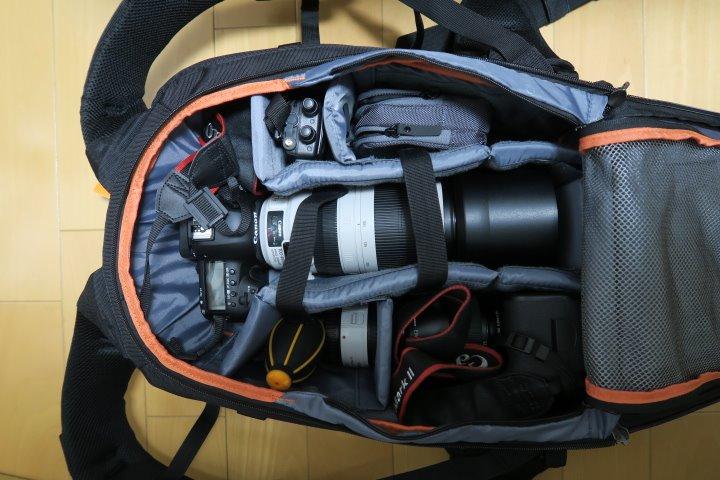 ヒコーキ撮影用に購入しました。CANON 7D Mark2 + EF-S 18-135CANON 5D Mark4 + EF100-400L2(フード付き)テレコン×1.4ブロアーレシーバーコンデジを入れてみましたが、すんなり入りました。しかし、細かいところで価格相応な部分が多々あります。仕切りのマジックテープが止める場所が2本の帯しかない貧弱さ、中で動いてしまうのでは?と思うような接着感。メッシュの仕切りのジッパーがむき出しで、カメラを痛めそう。腰のベルト取り付け部分も貧弱。立ったまま機材を交換するときに落ちたら・・・価格相応です。お薦めはしません。高価ですが、ロープロ等を購入された方が安心感はあります。