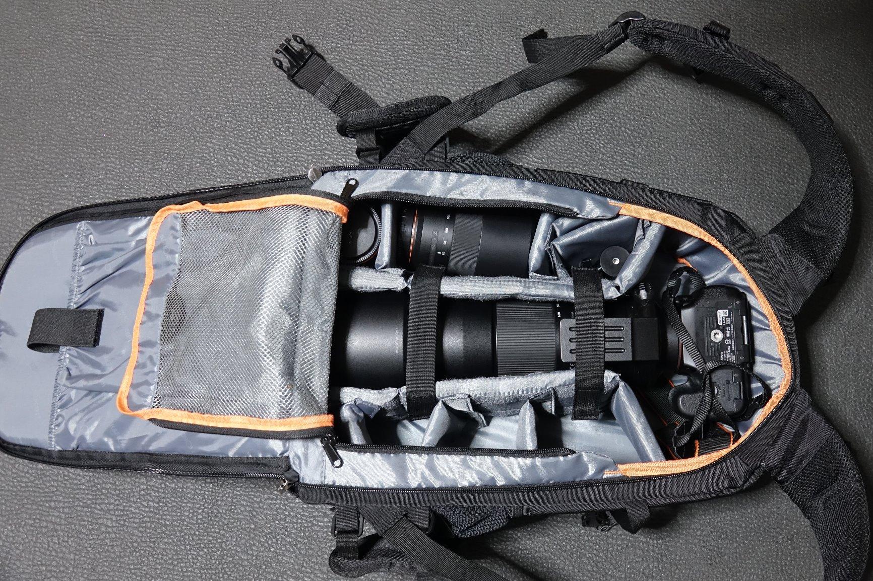 一眼+レンズ3本+充電器を入れても十分な収納。一眼は中型であるが、大判の方が座りは良さそう。もう2本ほどレンズが入る余裕があり、自分には十分な収納力。上部取っ手や腰ベルト、チェストの補助ベルトなど登山リュック並みのサポートがあり気にいている。取っ手やパッドも十分な厚みがあり良し。メイン収納が背の内側からのアクセスのみなので、ファスナー締め忘れなどの事故からは守ってくれるが、取り出すのに慣れが必要?微妙な仕様に★4つ。しかし、総じてとても良い。購入して良かった。