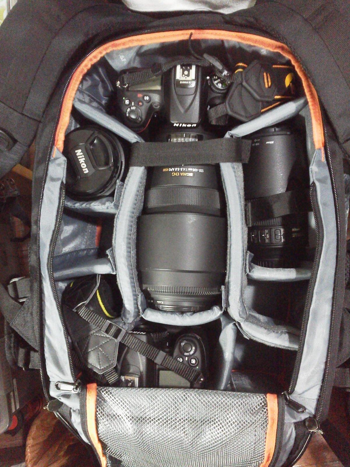 私のカメラギア用の優れたバックパック。実際、これまでに購入した中でおそらく最高のものだと思います。私が考えることができる唯一の欠陥は、内部のコンパートメントのいくつかは、それを固定するベルクロのストリップしかないということです. バックパックは驚くほど広々としており、100-400 レンズを取り付けた Canon 70D と 18-250 レンズを取り付けた 500D も簡単に収納できます。他のアイテムを入れる余地はまだあります。フロントポケットには、キンドルやその他のスペアアイテムを収納できます。もう 1 つの優れた機能 (以前のバッグのように、ロープロ フリップサイド) は、後部の開口部があり、外出時のセキュリティが強化されています.要するに、このバックパックを強くお勧めします.