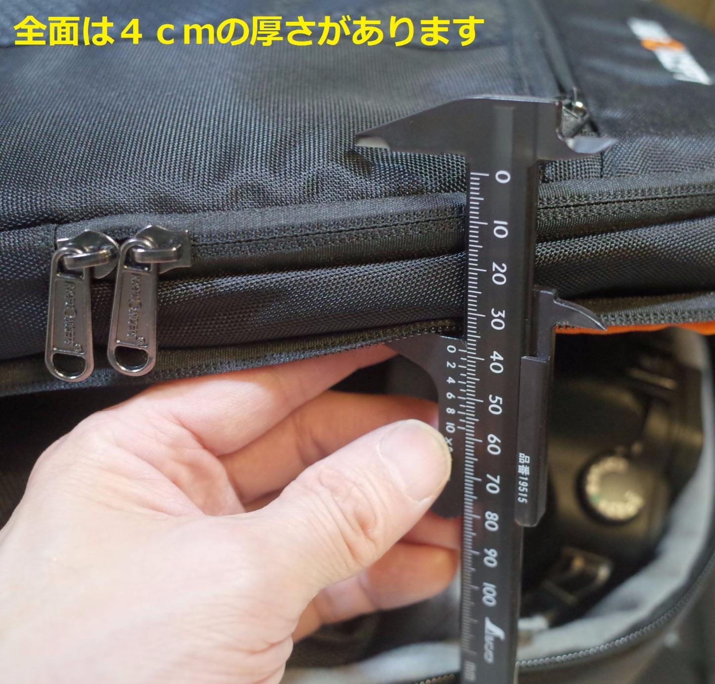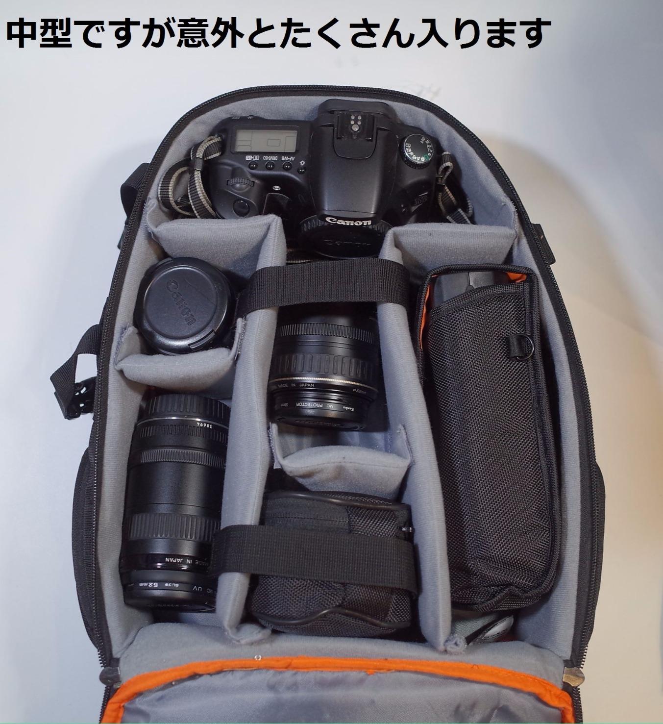 カメラが好きでモニターに参加しました。サイズとしては中型ですが、意外と容量があって、カメラ1台とレンズが2,3本に大型のストロボくらいまで楽に入ります。量販店に比べるとかなり安いのですが、品質的には1万2000円くらいの製品とほぼ同じで、背中のクッションや肩ベルトのクッションも2cmくらい厚みがあって、重い機材を背負ってもあたるようなことは全くありません。全面とサイドに小物入れがあり、ポケットの数がけっこう多いのも特長です。レインカバーも付属しています。左サイドに三脚をつるすこともできますが、この状態ではレインカバーができないのがちょっとだけ残念。品質的にはまったく問題ありませんし、なによりこの価格では普通の量販店では手に入りませんから、大変お買い得だと思います。カメラバッグの新調を検討されている方には、候補のひとつとして十分おすすめできると思います。