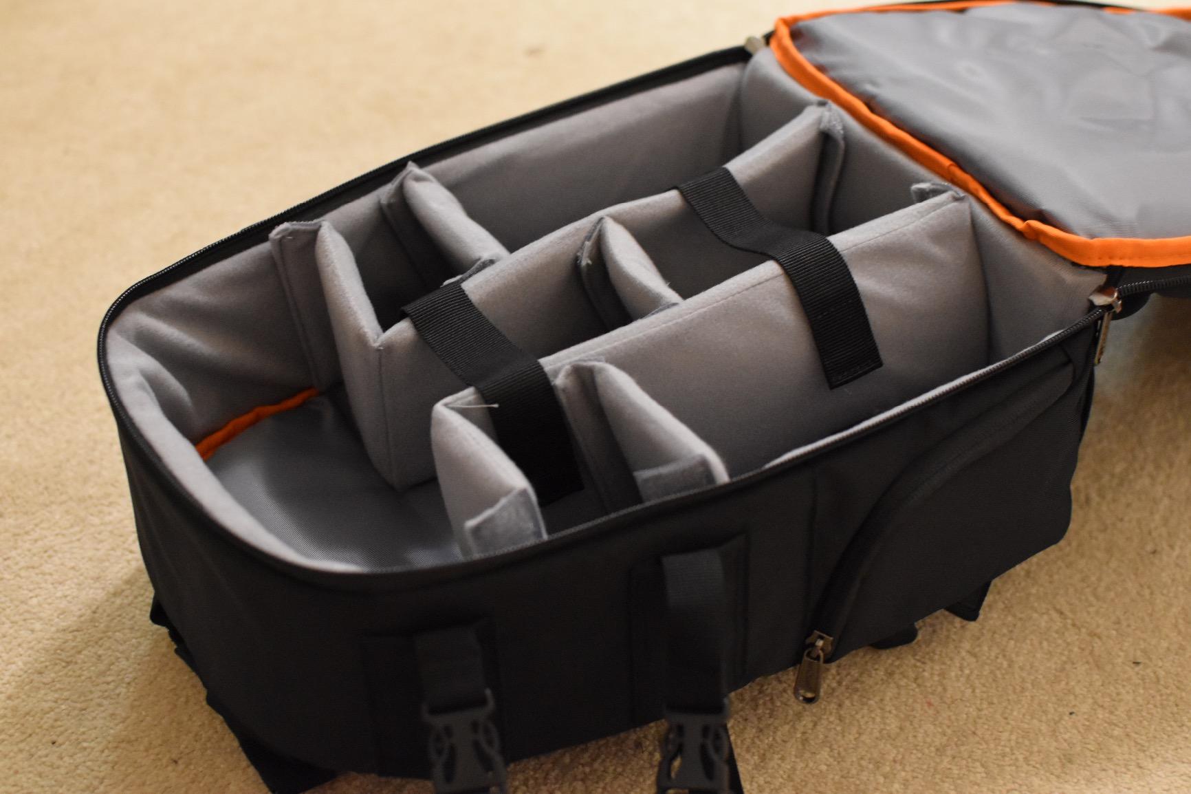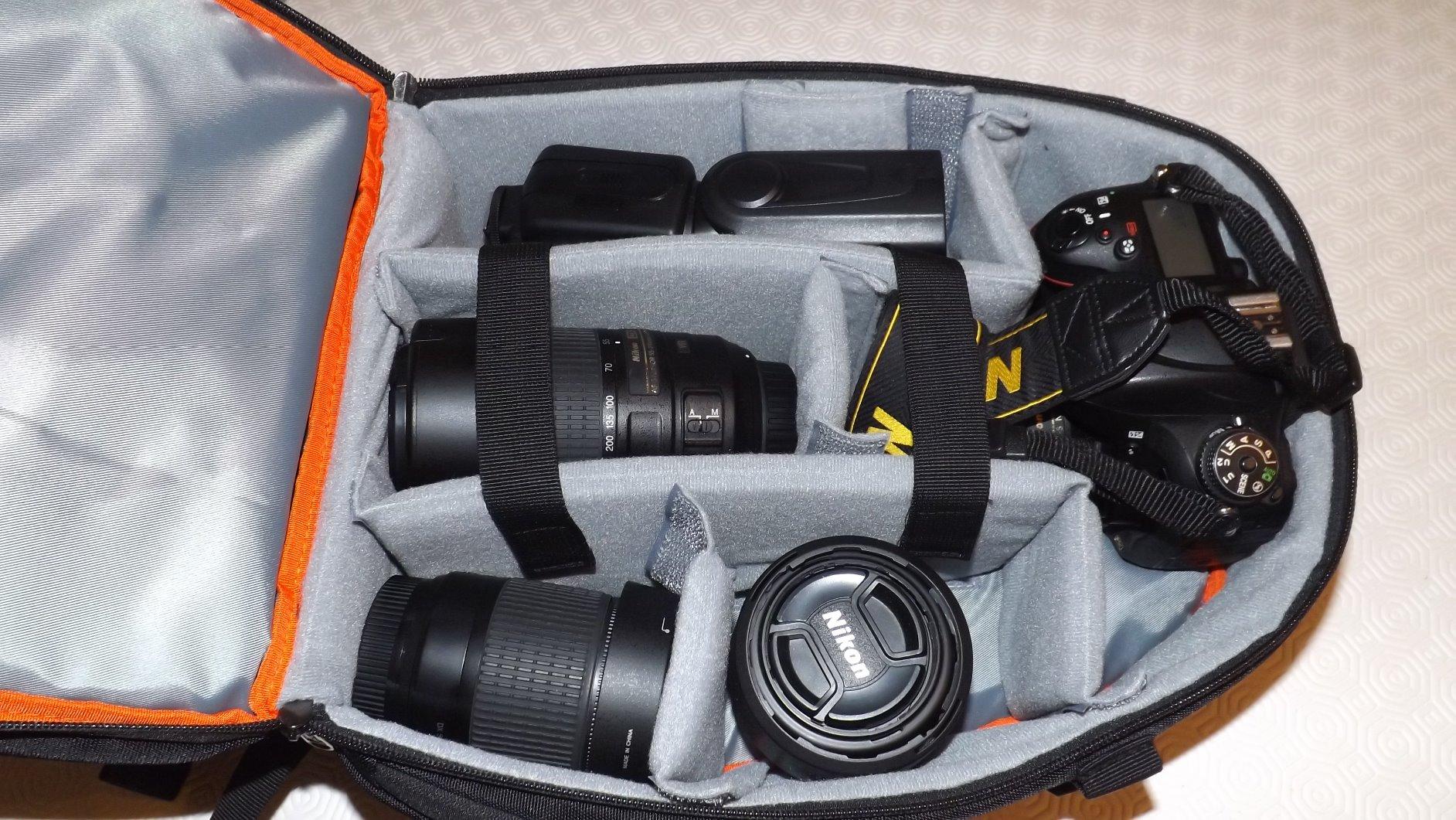 これは超よくできたカメラバッグです。非常にコンパクトですが、一眼レフと3つのレンズを取るのに十分な大きさです。パディングはとても良いです。あらゆる種類のアクセサリー用のコンパートメントがたくさんあります。ストラップは快適でパッド入りです。防水カバーが含まれており、独自の小さなバッグがコードで取り付けられているため、紛失することはありません。小さなチューブの穴もあるので、ハイキングをするときに水袋を使用できます。本当に私はこのバッグに欠点を見つけることができません。強くお勧めします、これは私が私の意見を喜んで与えたレビュー項目でした。