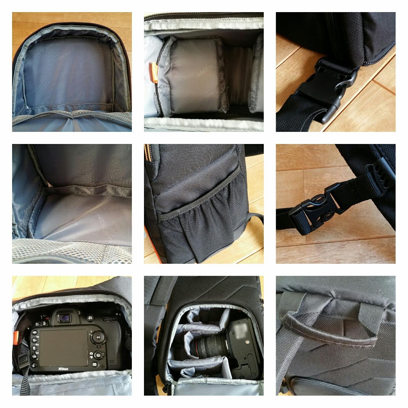 ニコンのD7200を入れてます。上段の収納の写真にオレンジ色のジッパーが見えたので、ジッパーポケットがあると勘違いしてましたが、ポケットはありませんでした、これは紛らわしい。サイドのカメラを取り出すところにカード等を入れるポケットがありますが、ポケットは上下(左右)合わせになっているため落ちることはありません。仕切りはマジックテープで固定ですが、サイド側は開けやすいようにオレンジのタブが付いてます。タブレットを入れる収納のジッパーは、サイドのカメラ取り出し側と同じ方にあったらより使いやすかった。右側のメッシュポケットは500mlのペットボトルが入ります。持ち手はちょっと安っぽい。三脚固定用のベルトが1つしか付いてなかったのですが、メールをしたらすぐに発送してくれました。中国からということで4日かかりましたが。スリングタイプで同じ価格帯ではベストな買い物をしたと思ってます。
